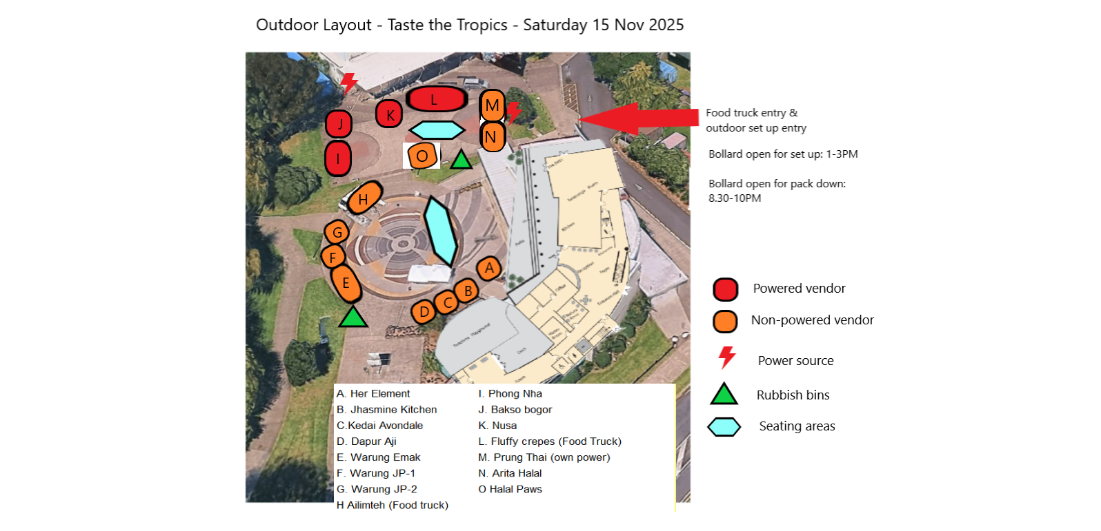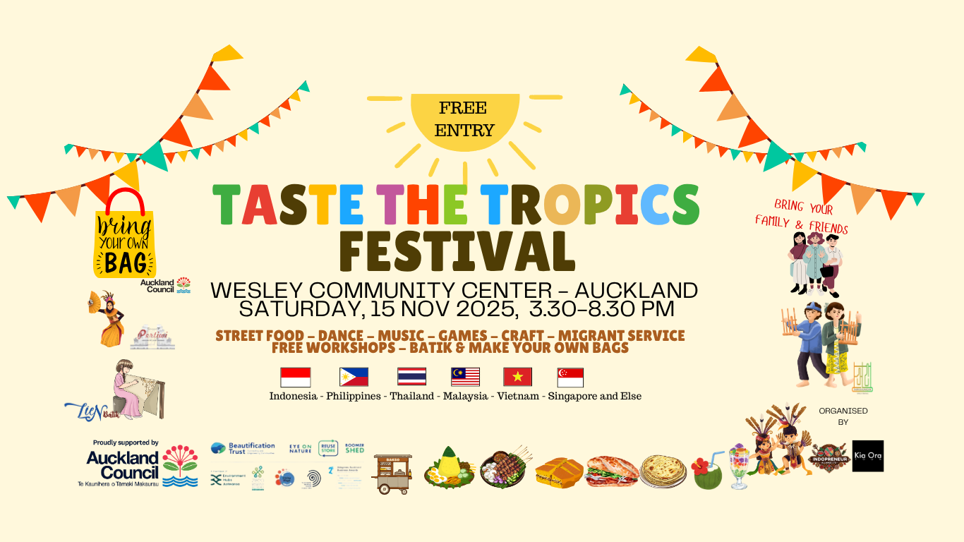 Join us at the Taste the Tropics Festival and immerse yourself in the vibrant diversity of Southeast Asia. Indulge in a variety of authentic Southeast Asian cuisines, enjoy captivating live music and cultural performances (angklung), and connect with Southeast Asian businesses and communities.